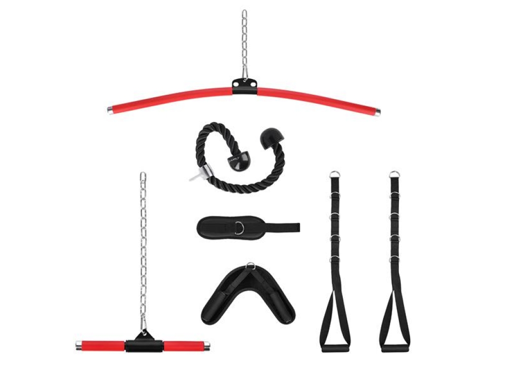 S posilňovacou vežou je dodávaná bohatá sada príslušenstva, vrátane širokého adaptéra, tricepsového adaptéra, popruhu na členok, dvoch reťazí, dvoch jednoručných adaptérov a tricepsového lana. Vďaka týmto doplnkom môžeš spestriť svoj tréning a efektívne zapojiť rôzne svalové skupiny.