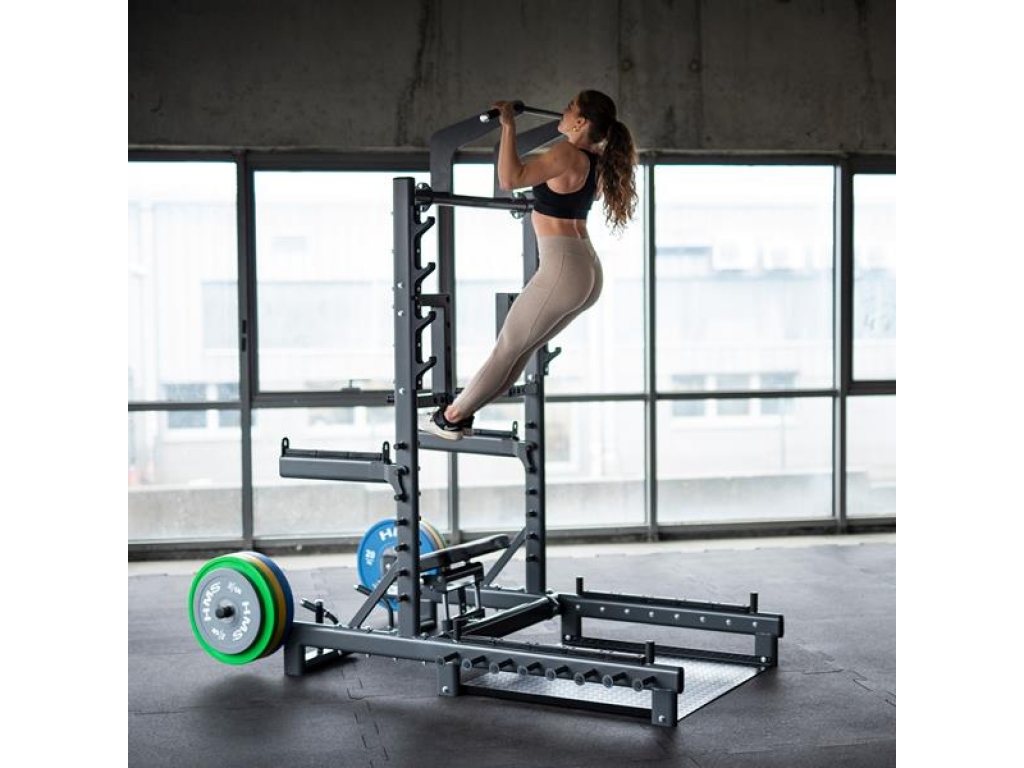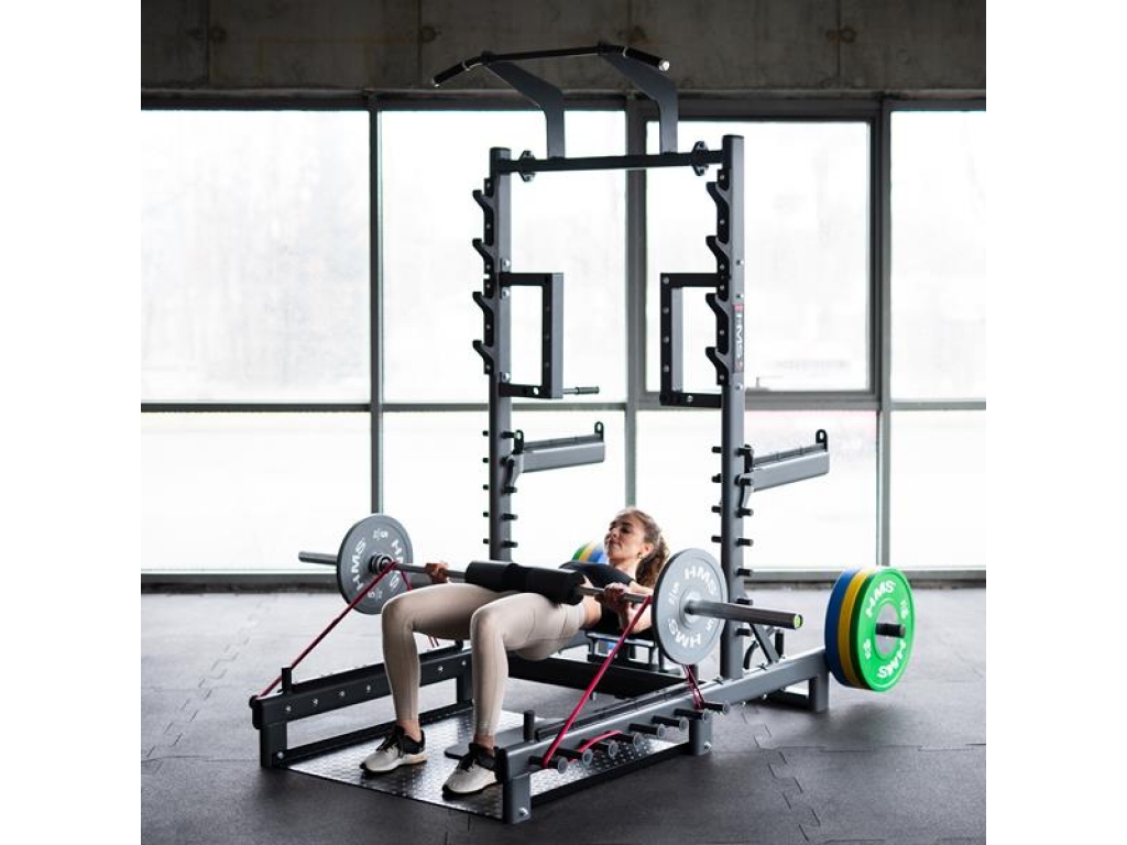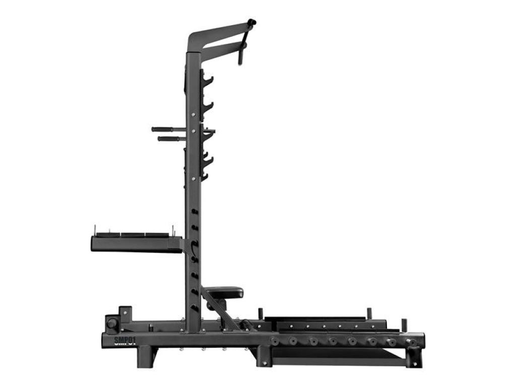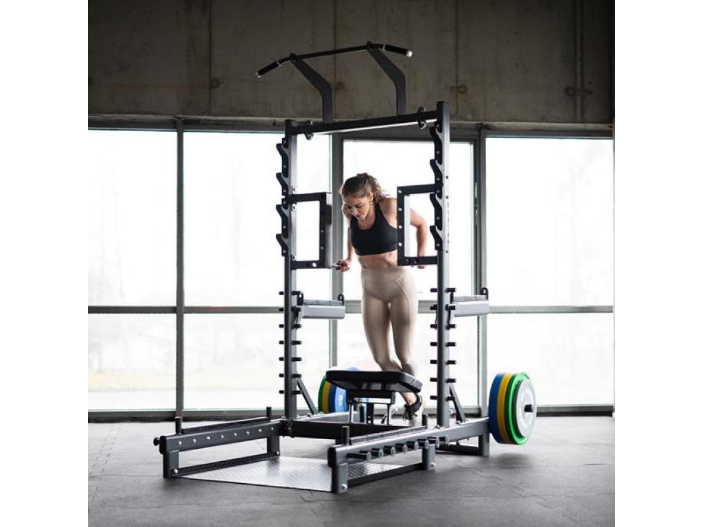 Vďaka úchytom na činku a pevným bezpečnostným zarážkam poskytuje SMP01 komfortné a bezpečné vykonávanie drepov s činkou a ďalších cvikov s ťažkými váhami. Navyše dva tŕne na skladovanie kotúčov umožňujú jednoduchú organizáciu vybavenia vo vašej tréningovej zóne.