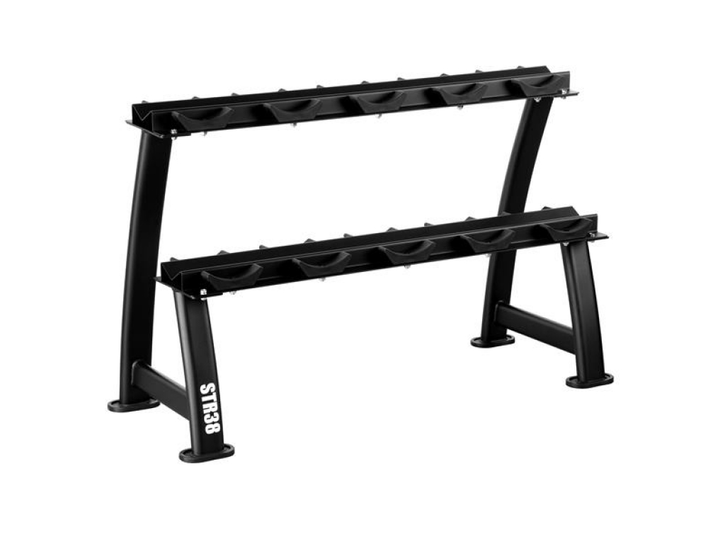 STR38 je robustný a funkčný dvojúrovňový stojan na činky, ktorý umožňuje prehľadne uložiť až 300 kg závažia. Vďaka širokej, stabilnej konštrukcii a premyslenej ergonómii zaručuje maximálne pohodlie a bezpečnosť pri používaní zariadenia.