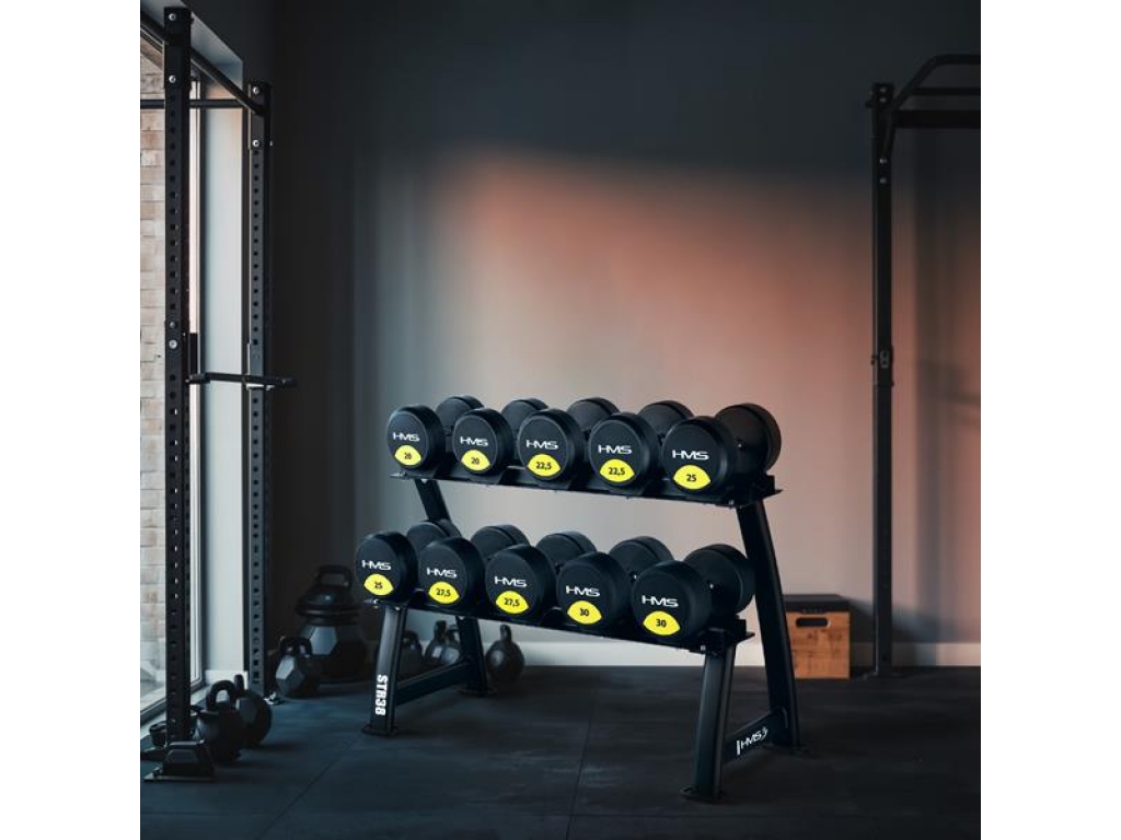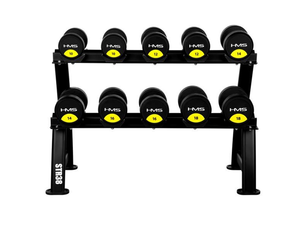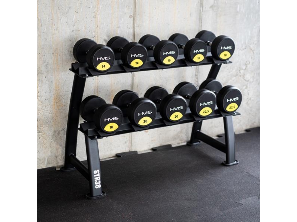 Stojan STR38 ponúka dve úrovne na uloženie až 10 párov činiek. Vďaka mierne naklonenému povrchu je úchop činiek pohodlný a nevyžaduje nadmerné ohnutie zápästia, čo znižuje záťaž kĺbov a zvyšuje pohodlie.