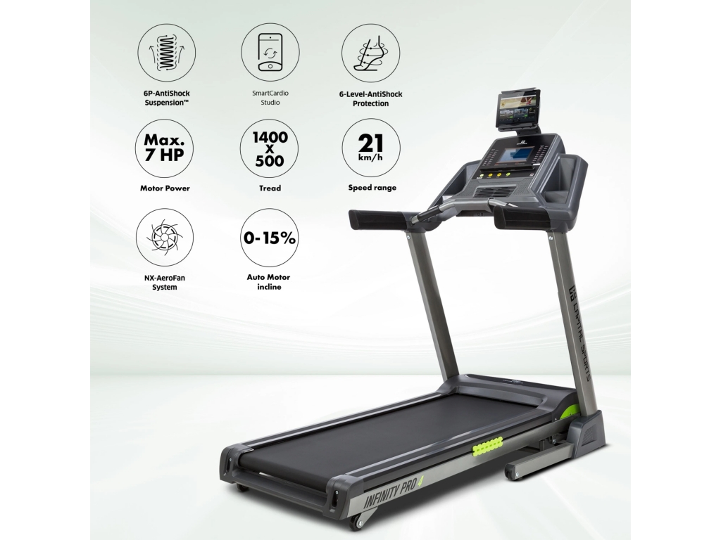 So sériou bežeckých pásov Infinity od spoločnosti CAPITAL SPORTS bude váš kardio tréning cvičením na vysokej úrovni! Bežecký pás CAPITAL SPORTS Infinity Pro 4.0 prináša najmodernejšie technológie bežeckých pásov pre váš vytrvalostný tréning a kardio tréning s extra veľkou bežeckou plochou a spája ju s funkčným rozhraním, ako je úplná integrácia aplikácie Kinomap-App so spätnou väzbou cez bluetooth. Okrem toho ponúka mnoho užitočných funkcií, ako je napríklad systém NX-AeroFan Twin System pre neustály prílev čerstvého vzduchu a chladenie, integrované reproduktory a kombinovaný systém 6P-AntiShock Suspension pre veľmi prirodzený spôsob behu, vďaka ktorým takmer zabudnete, že trénujete - úplne nezávisle od počasia alebo dennej doby!