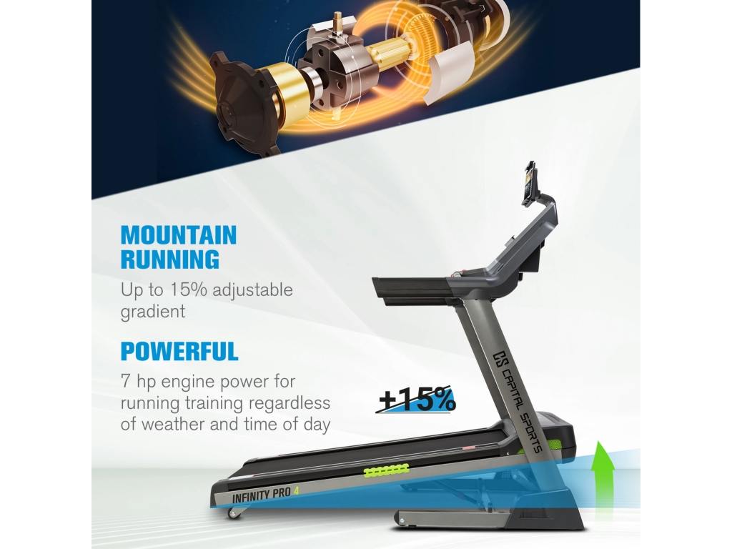 INFINITY: Domáci bežecký pás CAPITAL SPORTS Infinity Pro 4.0 prináša najmodernejšiu technológiu bežeckého pásu pre váš vytrvalostný a kardio tréning a kombinuje ju s funkciami prepojenia, ako je úplná integrácia aplikácie Kinomap so spätnou väzbou cez Bluetooth.