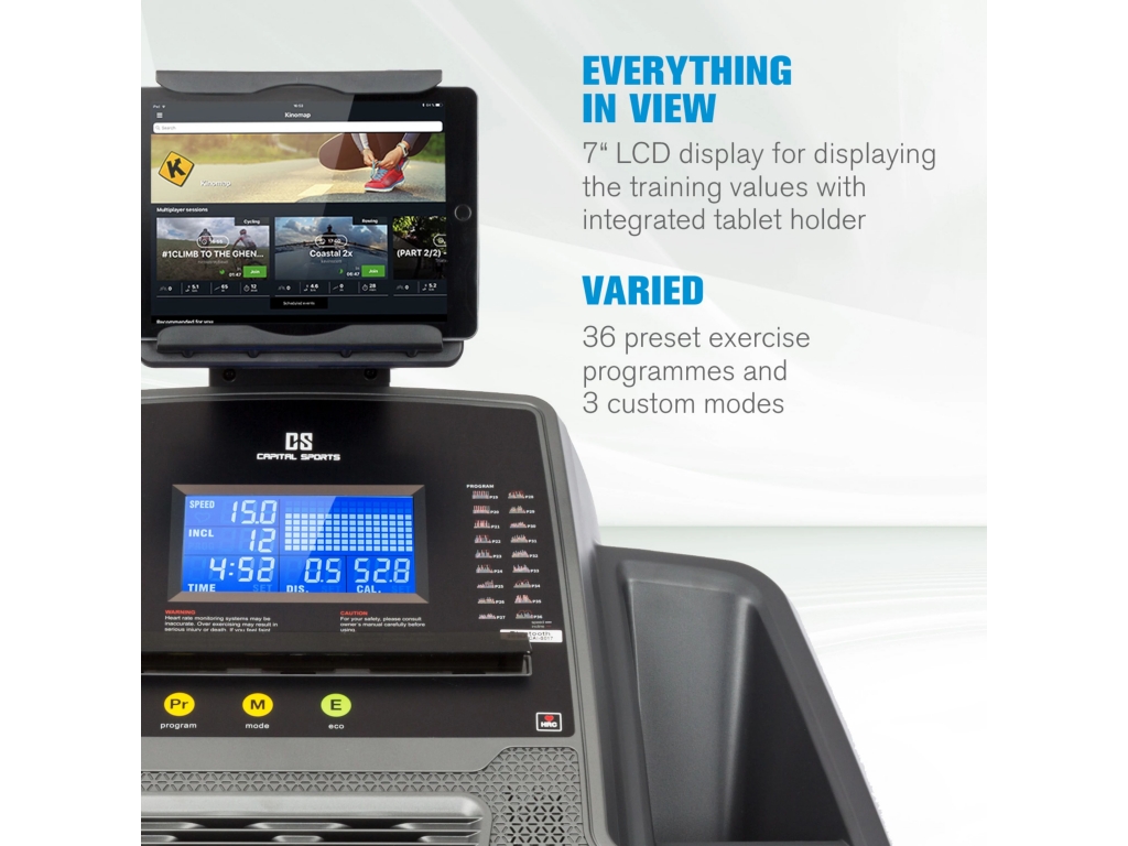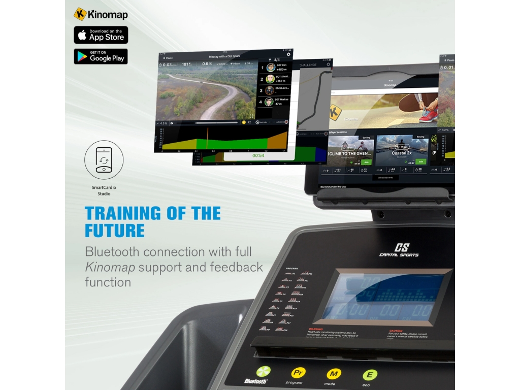 Vitajte v multimediálnom a konektívnom tréningu budúcnosti: rozhranie bluetooth 4.0 umožňuje bežeckému pásu CAPITAL SPORTS Infinity Pro 4.0 úplnú integráciu aplikácie Kinomap. Tá poskytuje nielen prístup k tisíckam kilometrov bežeckých tratí, ale je tiež pripojená k bežiacemu pásu ako systém priamej spätnej väzby. Vyhodnocuje na jednej strane vaše výkonnostné údaje, ako sú rýchlosť, pulz alebo prejdená vzdialenosť, a na druhej strane riadi priamo úroveň stúpania podľa zvolenej bežeckej trate. Takže môžete behať cez mestá a lesy bez toho, aby ste opustili svoj byt. Komu to nestačí, ten sa môže zúčastniť mnohých podujatí pre viacerých hráčov: otestujte si kondíciu v priamom porovnaní s tisíckami ďalších bežcov - pocit ako pri Berlínskom maratóne. Alebo umožnite komunite zúčastniť sa vašich vlastných bežeckých tratí. Natočte cestu s outdoorovou kamerou, nahrajte ju do aplikácie Kinomap a vašu trasu budú môcť behať mnohí fitnes nadšenci po celom svete.
