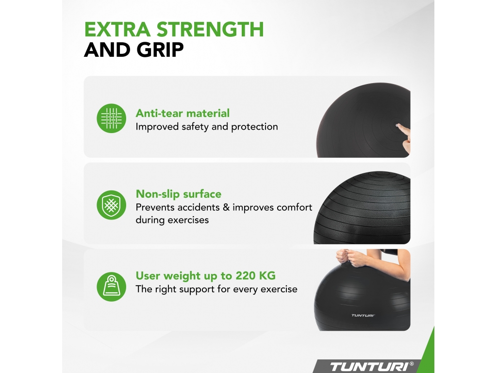 Gymnastická lopta TUNTURI zosilnená 65 cm, svetlo-modrá. Hľadáte cvičebnú loptu, ktorá nielenže posunie vaše cvičenie na vyššiu úroveň, ale je tiež dostatočne univerzálna pre jogu, strečing, a dokonca aj pre pohodlné sedenie pri pracovnom stole? Cvičebná lopta Tunturi Anti Burst je navrhnutá pre optimálnu podporu s nosnosťou až 220 kg, čo zaisťuje odolnosť a stabilitu pri každom pohybe.
