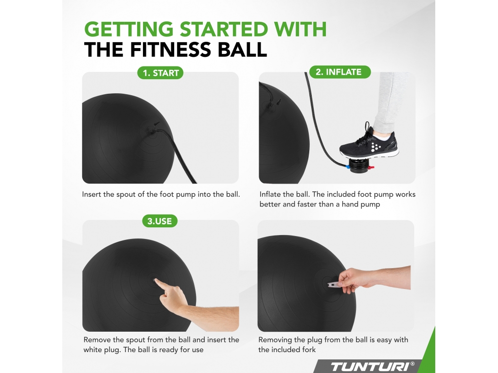 Cvičebná lopta by mala byť nielen účinná, ale aj ľahko použiteľný. Preto je cvičebná lopta dodávaná s pumpičkou, vidlicou a dvoma ventilmi. Tie uľahčujú nafukovanie a vyfukovanie lopty, čo je výhodné pri jeho skladovaní alebo prenášaní. Lopta je navyše vyrobená z vysoko kvalitného materiálu proti prasknutiu, ktorý je nielen príjemný na dotyk, ale aj mimoriadne pevný a ľahko sa čistí.