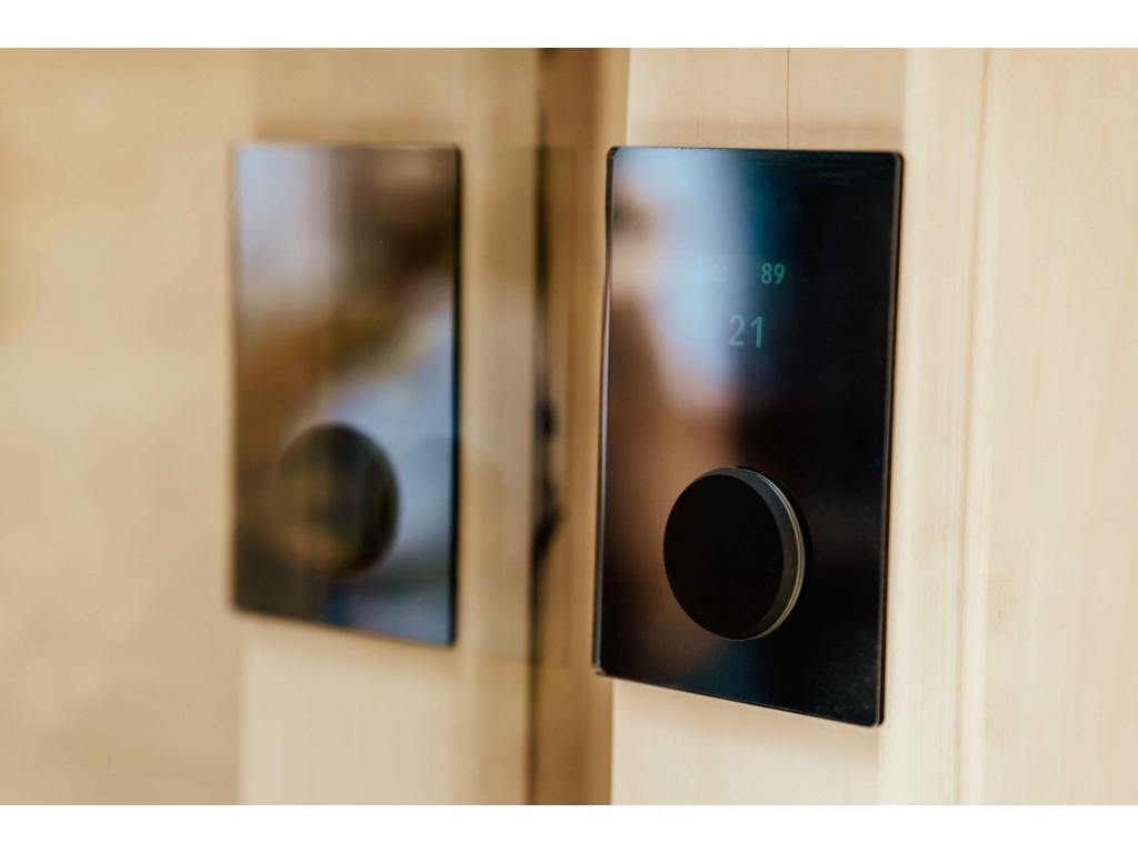 Sklenený ovládací panel, ktorý pridáva mimoriadne pohodlné diaľkové ovládanie prostredníctvom mobilnej aplikácie. S týmto ovládacím panelom stačí len pár kliknutí na tlačidlo mobilného telefónu, aby sa sauna vyhriala a bola pripravená, keď prídete domov.