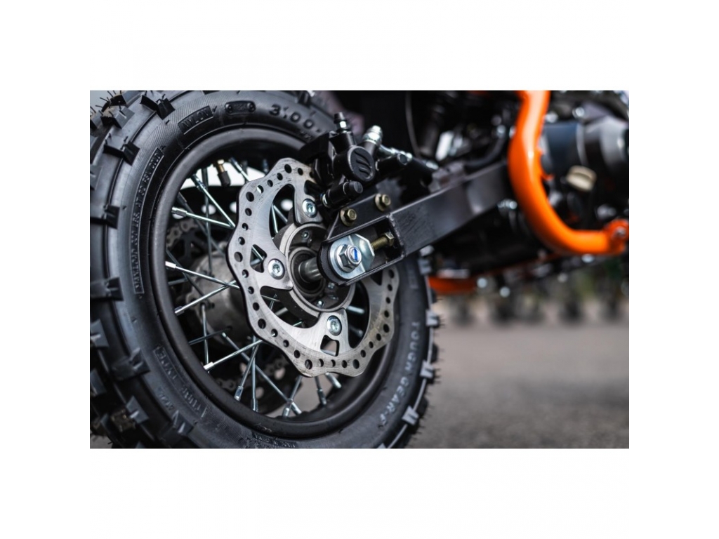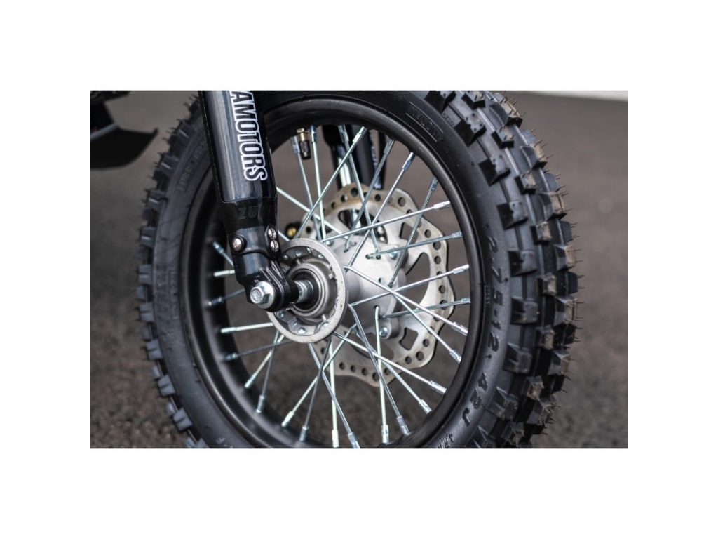 Bezpečnosť je prioritou, a preto je Spirit 90 vybavený hydraulickými kotúčovými brzdami na predných aj zadných kolesách, ktoré zaručujú spoľahlivý brzdný výkon v každom teréne. O stabilitu a komfort počas jazdy sa starajú hydraulické upside-down vidlice na prednej strane a zadný centrálny tlmič (monoshock), ktorý prináša vyvážený a pohodlný zážitok aj na nerovnom povrchu. Vďaka kombinácii 12" predného a 10" zadného kolesa s off-roadovými pneumatikami na vypletených ráfikoch je Spirit 90 pripravený zvládnuť akýkoľvek terén, od lesných chodníkov po hlinené dráhy. Tento model je navyše postavený na robustnom oceľovom ráme, čo zaisťuje jeho odolnosť a dlhú životnosť. Leramotors Spirit 90 12/10 je ideálnym pitbikom pre malé deti, ktoré chcú začať svoju motokrosovú cestu s bezpečným a spoľahlivým strojom.