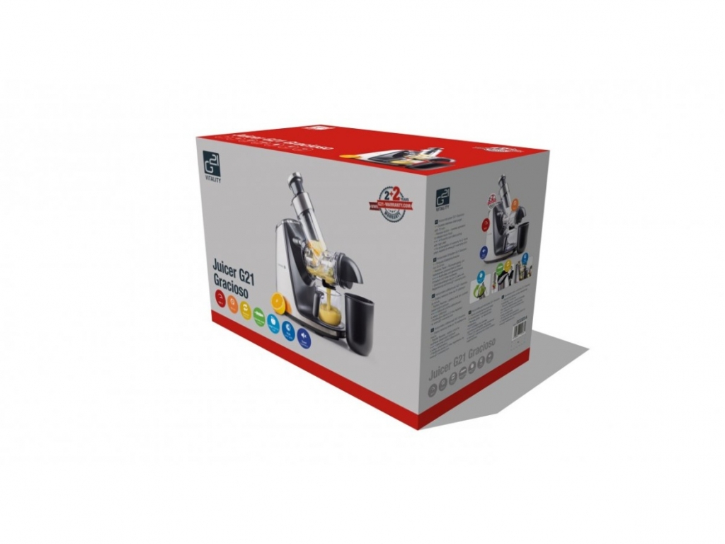 Robustná konštrukcia a kvalitné materiály robia z odšťavovača G21 Gracioso jednotku na trhu s odšťavovaním. Vďaka motoru s výkonom 200 W bez problémov spracuje aj tvrdú koreňovú zeleninu, ako je mrkva alebo zeler. Nerezový šnek si poradí so všetkým, ako lusknutím prsta vyrobí mrkvový džús s extra dávkou vitamínov.