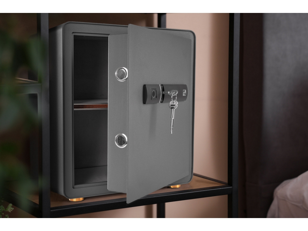 Pri bezpečnosti záleží na detailoch. K svojim cennostiam sa dostanete rýchlo, pohodlne, bezpečne a bez zbytočných hesiel. Dvierka sme vybavili biometrickým zámkom pre až 29 uložených odtlačkov prstov, ktorý po priložení prsta trezor otvorí v priebehu sekundy. A čo ak sa vybije batéria? Jednoducho použijete záložný bezpečnostný kľúč, ktorý je súčasťou balenia.
