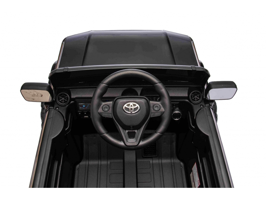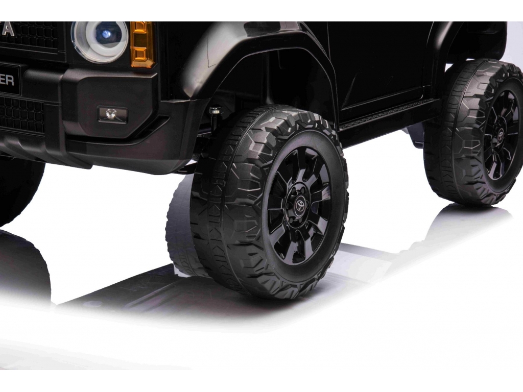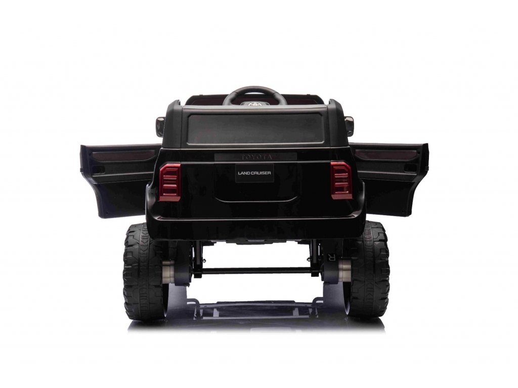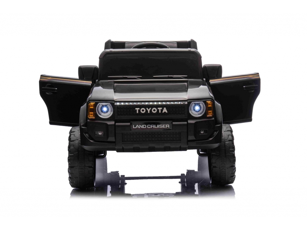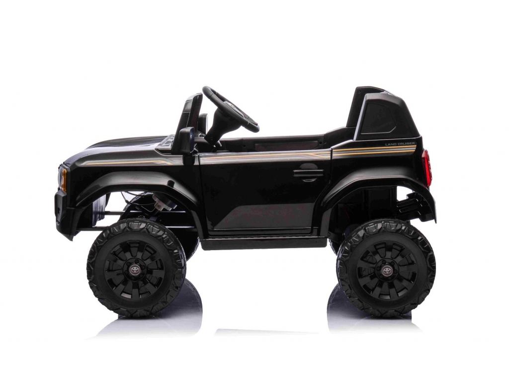 Elektrické autíčko Toyota Landcruiser 12V, čierne, široké jednomiestne sedadlo, 2,4 GHz diaľkové ovládanie, USB / AUX Vstup, Bluetooth, Odpruženie, Lítiová batéria, LED svetlá, 2 X 25W Motor, ORIGINÁL licencia