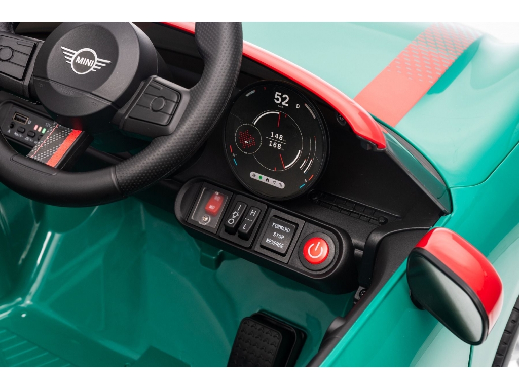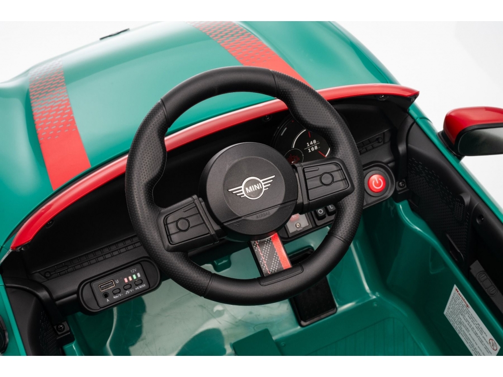 Štýlové elektrické autíčko s ikonickým dizajnom MINI. Dvojica otvárateľných dverí umožňuje pohodlné nastupovanie. Po zapnutí vypínača model imituje zvuk štartovania, svietia predné aj zadné LED svetlá. Nechýbajú zvukové efekty ako klaksón, zvuk jazdy, pesničky či melódie. K dispozícii je USB vstup a Bluetooth pripojenie. Hlasitosť sa ovláda priamo cez vstavaný MP3 prehrávač.