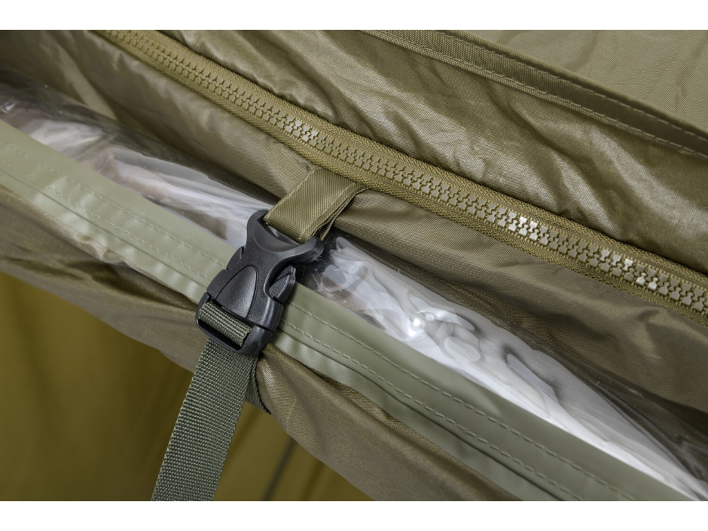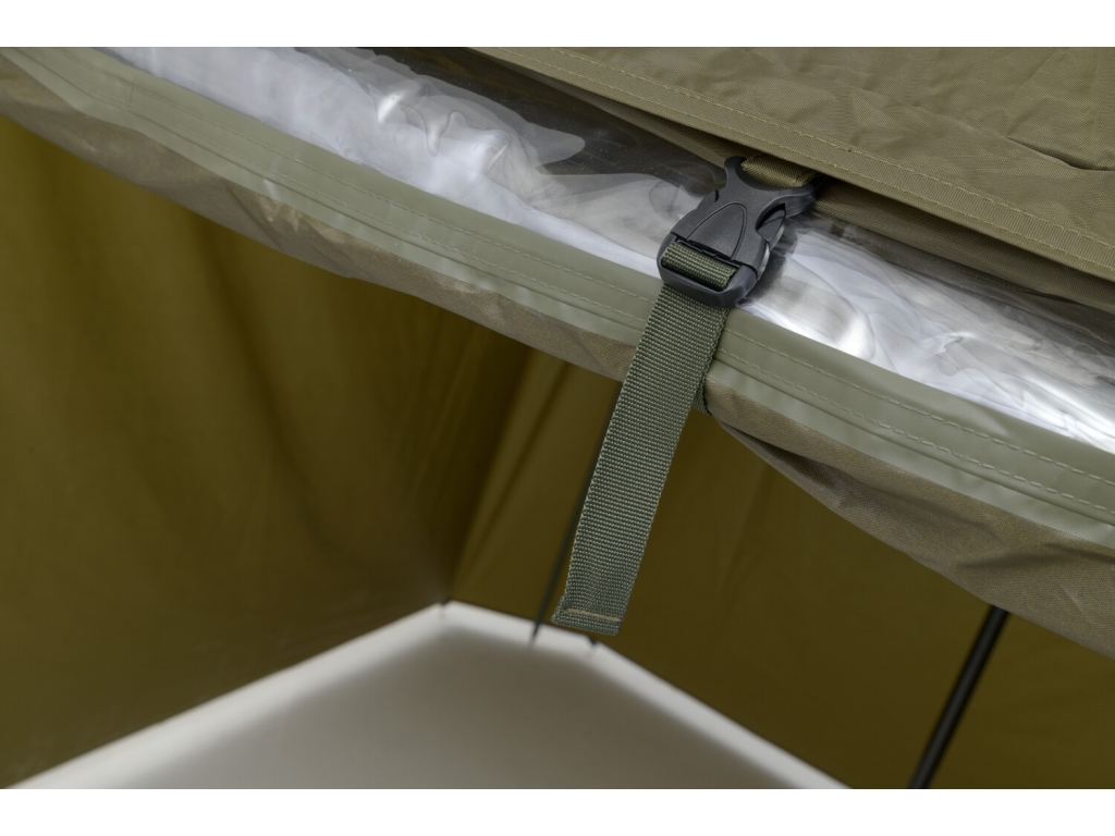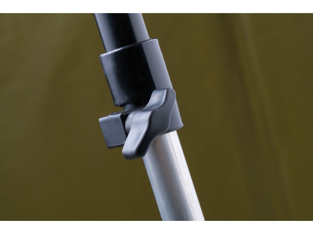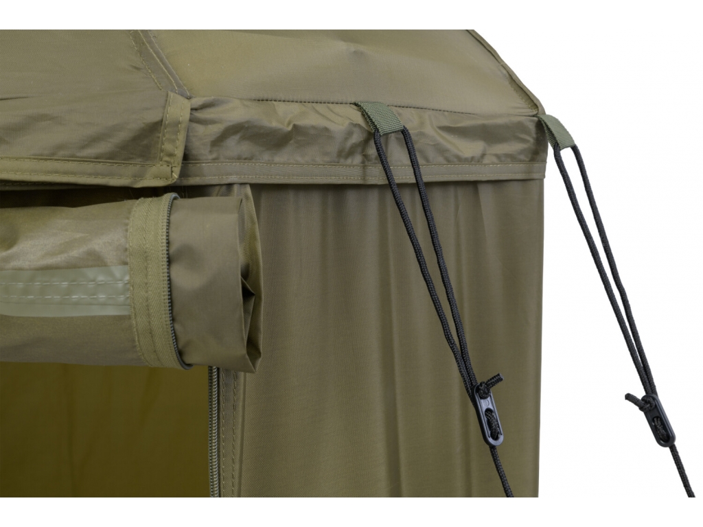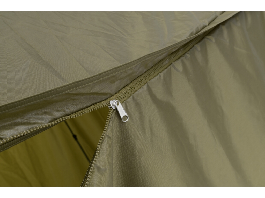 Predný panel s rozmerným oknom je možné ľahko rozopnúť a zrolovať nahor. Vo veternom počasí je možné dáždnik stabilizovať pomocou štyroch kotviacich laniek. Súčasťou dodávky je aj sada plnohodnotných bivakových kolíkov pre perfektné ukotvenie aj v náročných podmienkach. Skvelým doplnkom tohto dáždnika je unikátna stabilizačná sada do extrémnych podmienok dodávaná samostatne.