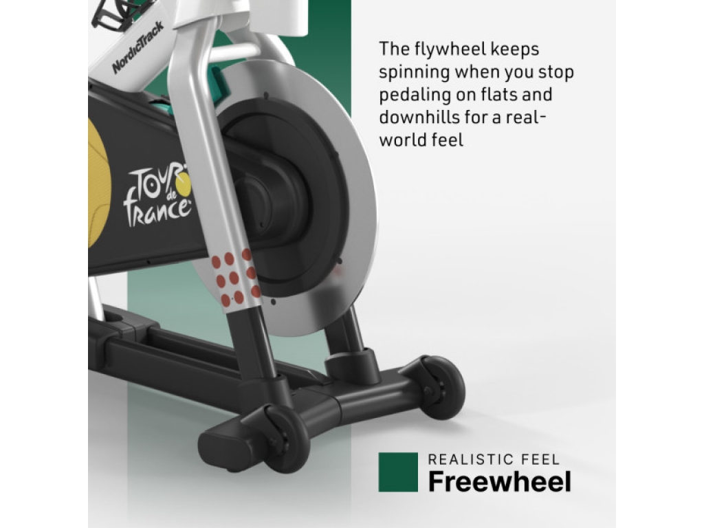 Na rozdiel od pevných systémov iných trenažérov má Tour de France Indoor Bike voľnobežku, ktorá umožňuje prestať šliapať, zatiaľ čo zotrvačník ďalej rotuje - pocit ako na ceste.