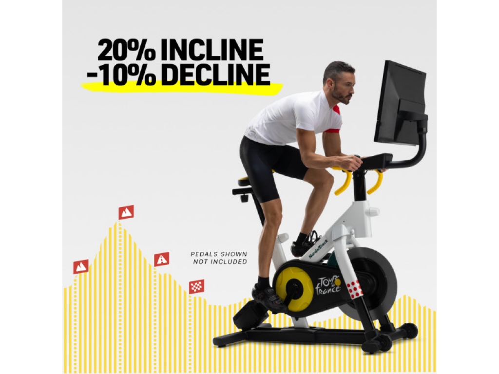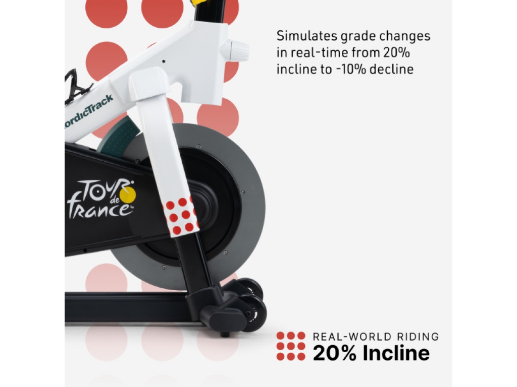 NordicTrack Tour de France Indoor Bike je oficiálne licencovaným produktom slávneho závodu Tour de France a ponúka najvyššiu úroveň indoor jazdy, akú si môžete dopriať. Užite si realistický pocit cestnej cyklistiky s extra pohodlím pre dlhé tréningy v sedle. Inšpirovaný tradíciou prestížnych dresov Tour de France oslavuje tento model ikonickú cyklistickú udalosť nielen farebným rámom, ale aj unikátnymi prvkami výbavy.