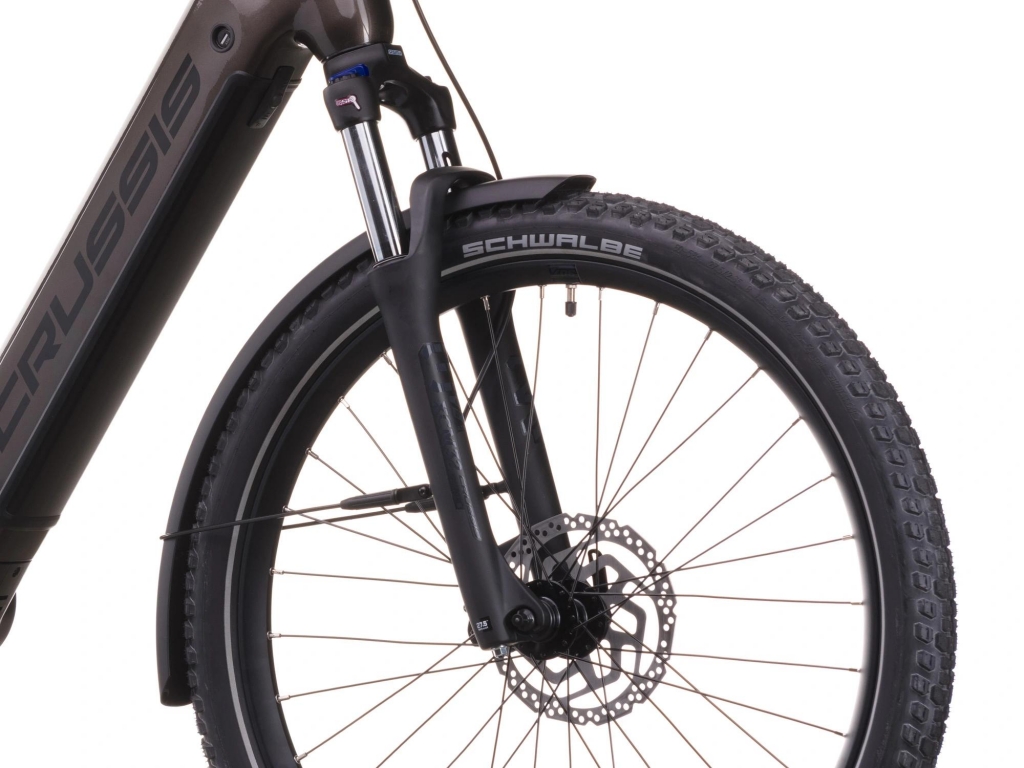 Odpružená vidlica SUNTOUR XCM32 NLO tlmí vibrácie z nerovností a spolu s pneumatikami SCHWALBE Johny Watts LR Performance prispieva k celkovému komfortu. Elektrobicykel je vybavený hydraulickými brzdami SHIMANO BR-MT200, ktoré rýchlo a presne reagujú aj za nepriaznivého počasia.