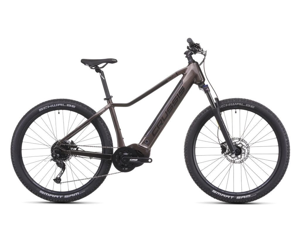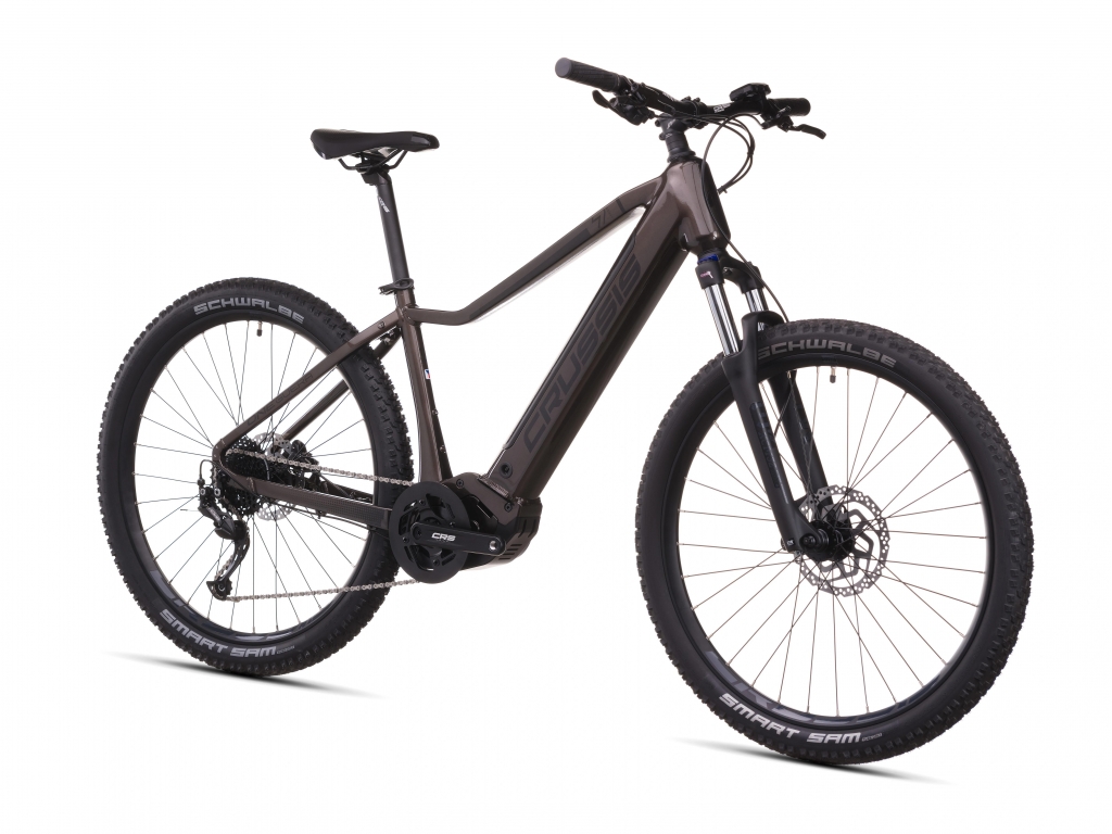 Stabilitu a istotu aj v ťažšom teréne zabezpečujú hydraulické kotúčové brzdy SHIMANO BR-MT200 a obľúbené pneumatiky SCHWALBE SMART SAM Performance. Pre pohodlie v členitom teréne je bicykel vybavený odpruženou vidlicou SUNTOUR XCM32 NLO DS 27,5" so zdvihom 100 mm a možnosťou uzamknutia. Jazdný komfort dopĺňa 9-rýchlostná prehadzovačka SHIMANO Alivio, ktorá uľahčuje prispôsobenie jazdy svahu terénu. Všetky dôležité informácie sú prehľadne zobrazené na farebnom LCD displeji PANASONIC, ktorý zostáva dobre čitateľný aj na slnečnom svetle.