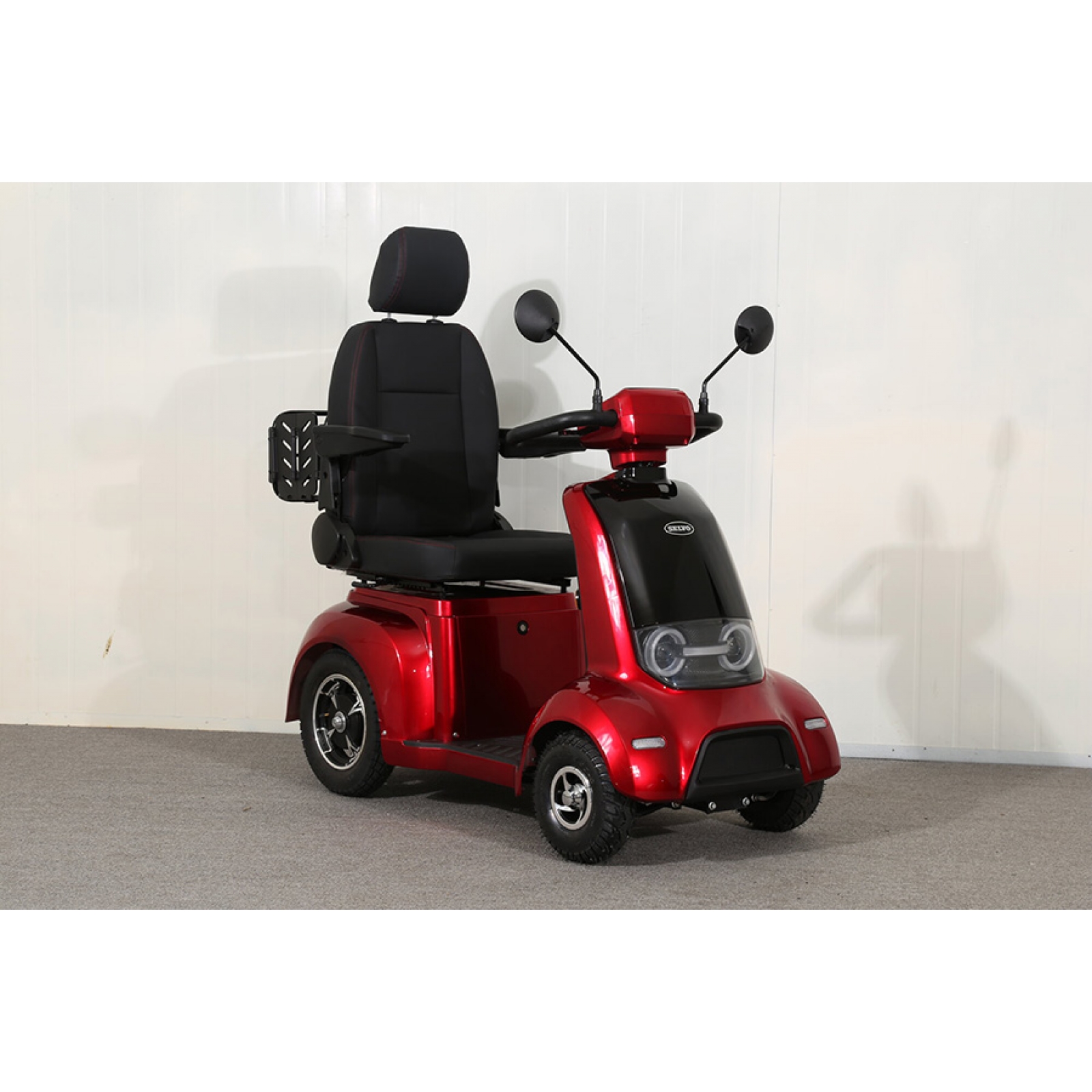 Štvorkolesový elektrický invalidný vozík SELVO 4810. Tento invalidný elektrovozík je prispôsobený pre potreby osôb so zhoršeným zdravotným stavom. Pomocou páčok na riadidlách veľmi jednoducho volíte rýchlosť pojazdu, ďalej máte možnosť max. rýchlosť obmedziť kolieskom (potenciometrom). Tento model umožňuje dokúpenie radu rôzneho príslušenstva ako je predný košík, zadný box alebo zadný skladací kôš. K dispozícii sú aj oceľové nárazníky, ktoré veľmi odporúčame na ochranu plastov. Prípadne sa môže hodiť aj držiak francúzskych palíc a krycia plachta. Polohovateľné sedadlo tvorí pohodlnú oporu celého chrbta. Lakťové opierky po oboch stranách pomáhajú ešte k vyššiemu komfortu.